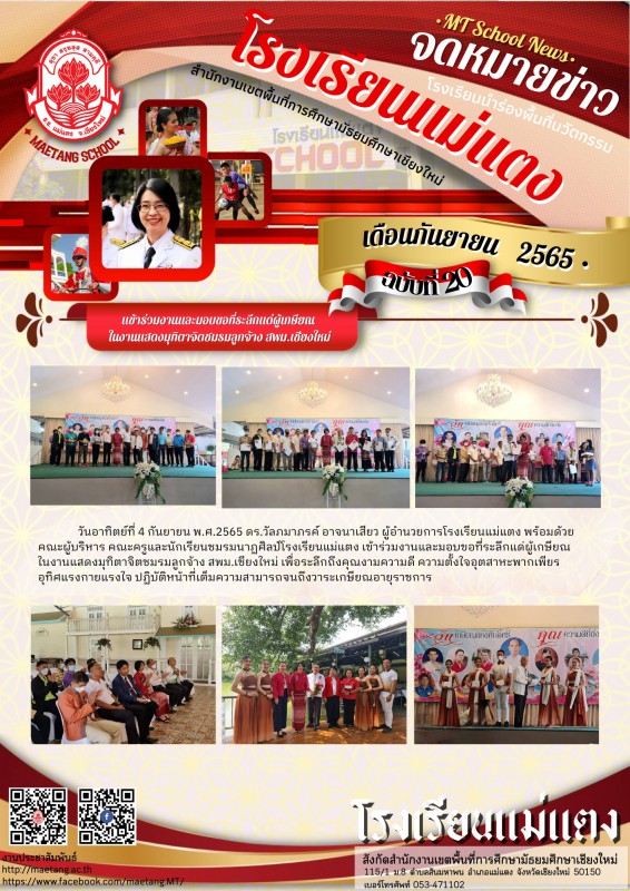 วันอาทิตย์ที่ 4 กันยายน พ.ศ.2565 ดร.วัลภมาภรค์ อาจนาเสียว ผู้อำนวยการโรงเรียนแม่แตง พร้อมด้วย คณะผู้บริหาร คณะครูและนักเรียนชมรมนาฎศิลปัโรงเรียนแม่แตง เข้าร่วมงานและมอบขอที่ระลึกแด่ผู้เกษียณ ในงานแสดงมุทิตาจิตชมรมลูกจ้าง สพม.เชียงใหม่ เพื่อระลึกถึงคุณงามความดี ความตั้งใจอุตสาหะพากเพียร อุทิศแรงกายแรงใจ ปฏิบัติหน้าที่เต็มความสามารถจนถึงวาระเกษียณอายุราชการ
