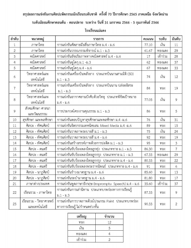 โรงเรียนแม่แตงนำโดย ดร. วัลภมากรณ์ อาจนาเสียว ผู้อำนวยการโรงเรียนแม่แตง ขอแสดงความยินดีแก่ตัวแทนนักเรียนโรงเรียนแม่แตง ที่ได้เป็นตัวแทนระดับเขตพื้นที่การศึกษามัธยมศึกษาเชียงใหม่เข้าร่วมการแข่งขันเนื่องในงานศิลปหัตถกรรมนักเรียนระดับชาติ ครั้งที่ 70 ภาคเหนือ ณ จังหวัดน่าน |