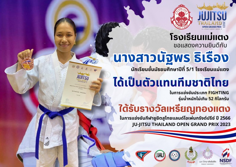 โรงเรียนแม่แตง ขอแสดงความยินดีกับ นางสาวนัฐพร ธิเรือง ประธานนักเรียนโรงเรียนแม่แตง นักกีฬาดาวรุ่งทีมชาติไทย......ดีกรีรางวัลเหรียญทองแดง ในการแข่งขันยูยิตสู ประเภท Fighting รุ่นน้ำหนักไม่เกิน 52 กิโลกรัม รายการ JU-JITSU THAILAND OPEN GRAND PRIX 2023 การแข่งขันกีฬายูยิตสูไทยแลนด์โอเพ่นกรังด์ปรีซ์ ปี 2566 ทำการแข่งขันระหว่างวันที่ 20-21 พ.ค. 2566 ณ มหาวิทยาลัยรังสิต และได้เป็นตัวแทนทีมชาติไทย